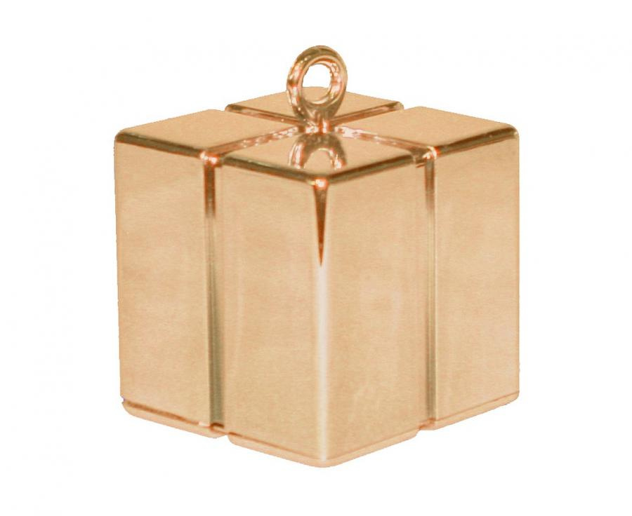 Elegancki i praktyczny ciężarek do balonów w kształcie prezentu, wykonany w kolorze gold rose. Waga 120 gramów, idealnie nadaje się do przytrzymywania balonów z helem na miejscu.