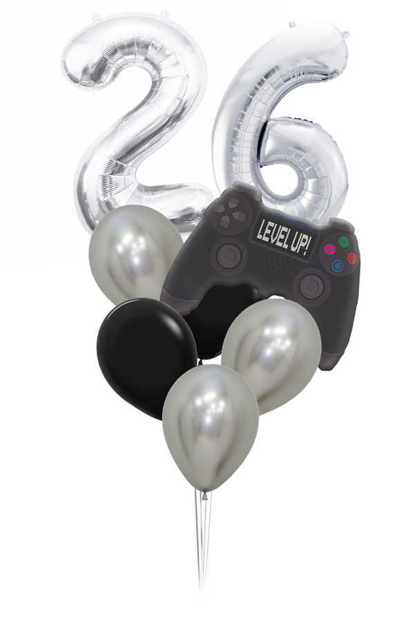 Zestaw balonów Bukiet balonowy urodzinowy srebrny dla fana gier z 2 cyframi do wyboru ( 8 szt.)