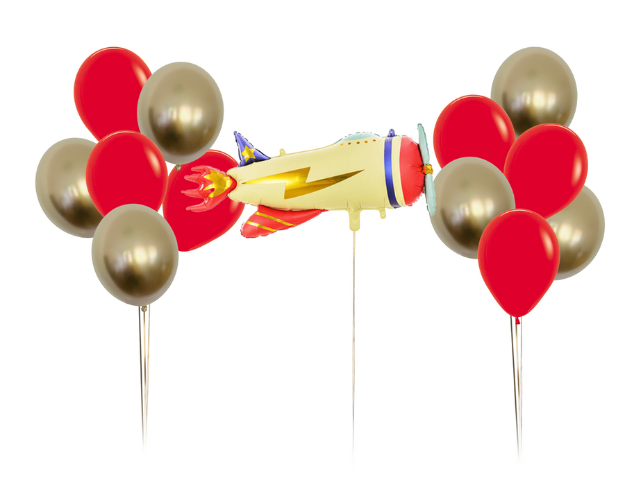 Wyrusz w podniebną podróż z wyjątkowym zestawem balonów z samolotem retro. Idealny na urodziny dla małego odkrywcy, miłośnika lotnictwa. Ten bukiet, w energetycznych kolorach czerwieni i złota sprawi, że każde przyjęcie zamieni się w prawdziwą podniebną przygodę!