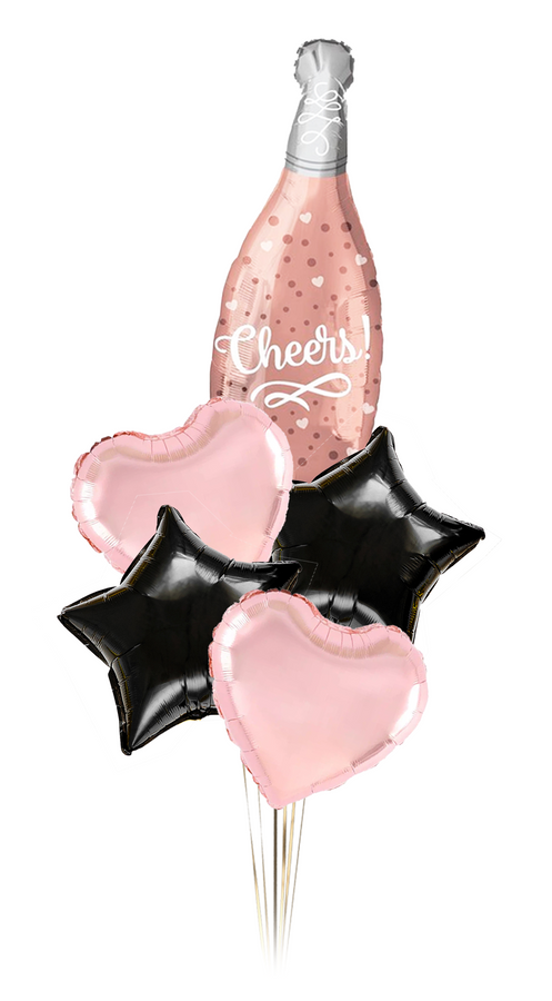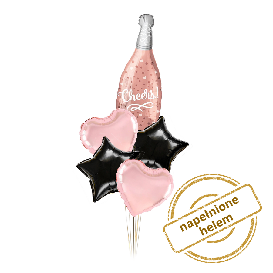 - Zestaw balonów z butelką szampana, czarnymi gwiazdkami i różowymi sercami.