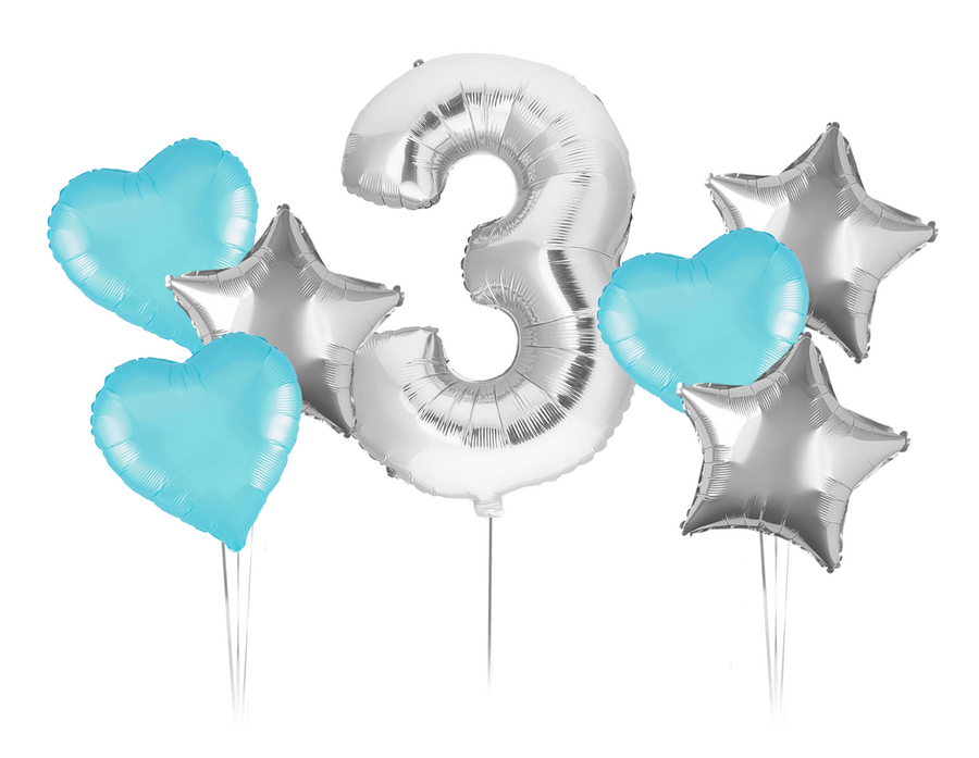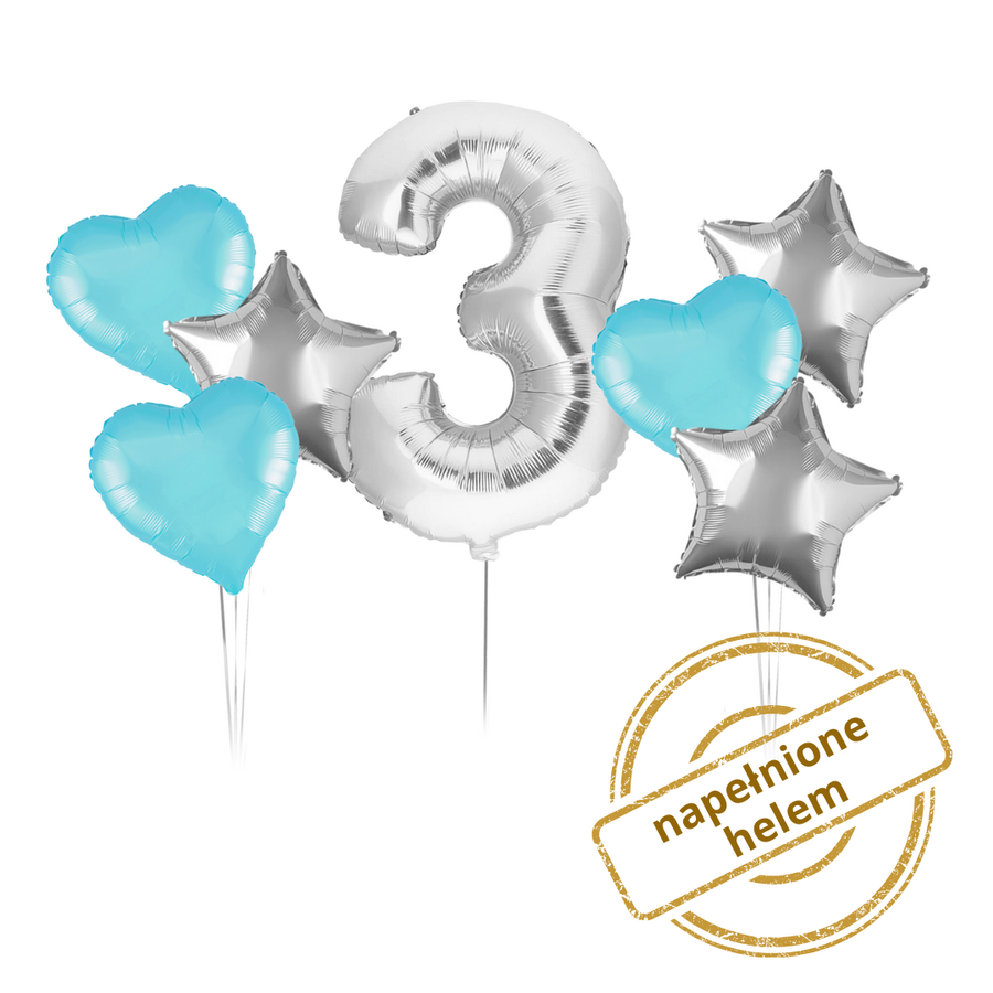 Zestaw balonów Bukiet balonowy urodzinowy niebiesko srebrny z cyfrą do wyboru ( 7 szt.) Z HELEM