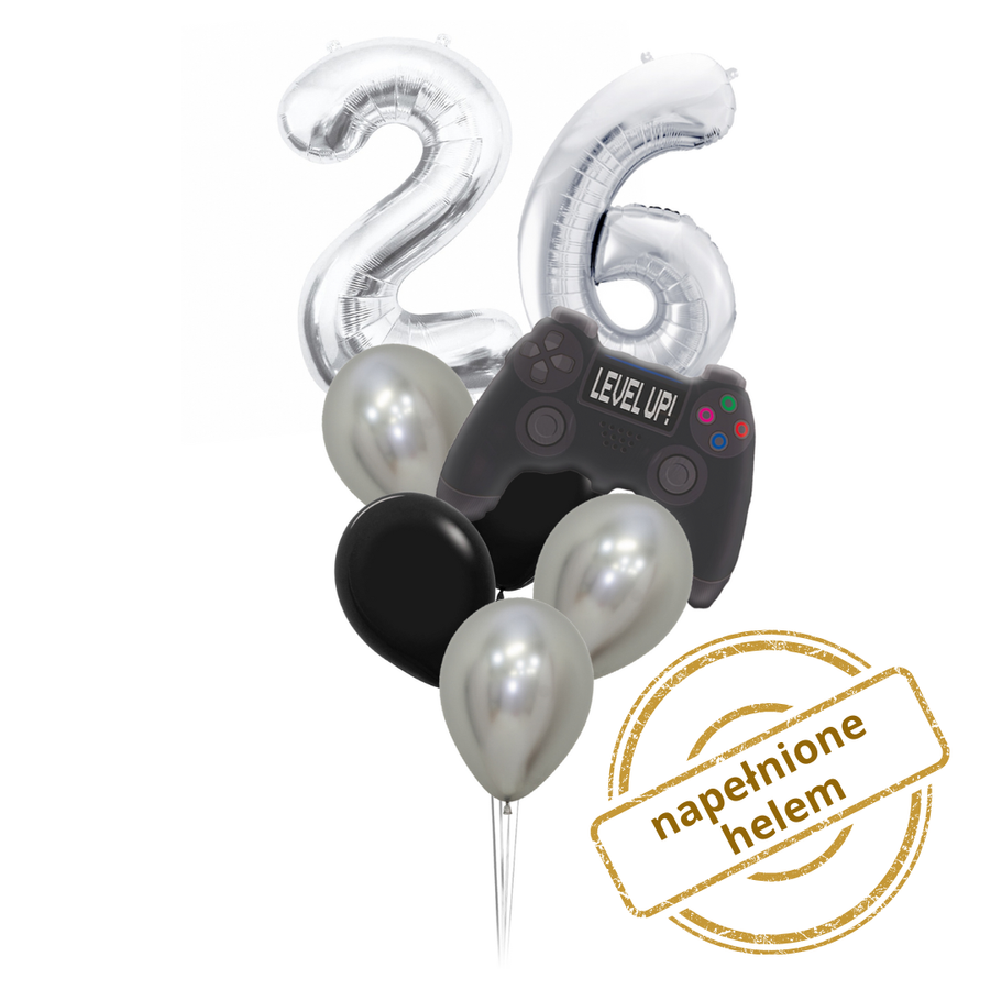 Zestaw balonów Bukiet balonowy urodzinowy srebrny dla fana gier z 2 cyframi do wyboru ( 8 szt.) Z HELEM