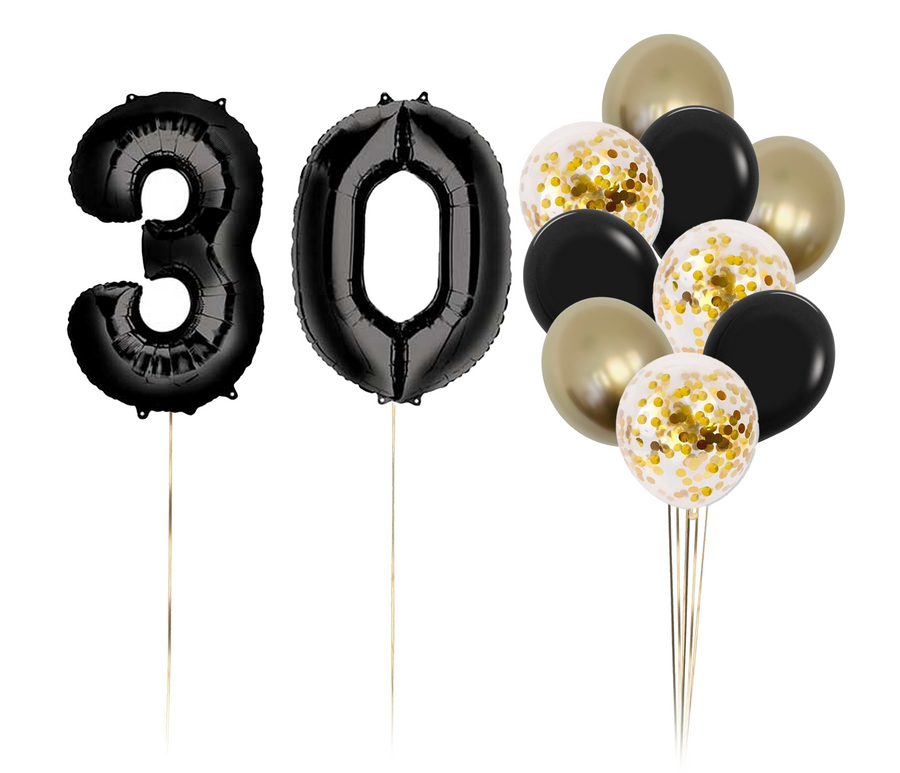 - Zestaw balonów z okazji urodzin z 2 cyframi do wyboru w odcieniach złota i czerni.