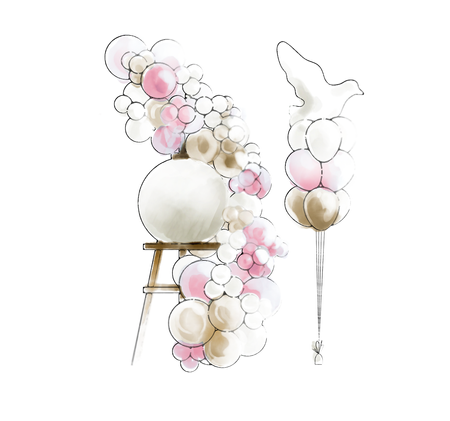 Subtelna i delikatna dekoracja balonowa składająca się z bukietu z helem oraz girlandy balonowej opartej na sztaludze, z personalizacją. Całość tworzy spójną, przyciągającą wzrok aranżację, idealną jako dekoracja wejścia, tła do zdjęć lub centralny punkt sali.