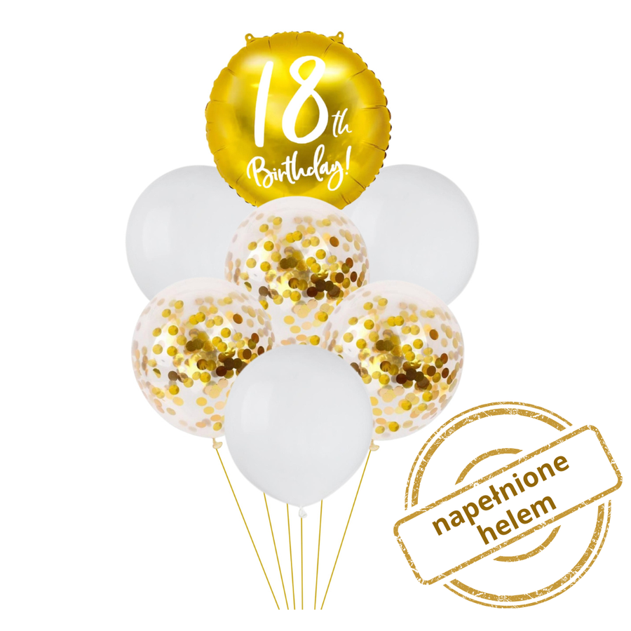 Zestaw balonów Bukiet balonowy na 18 urodziny biało złoty ( 7 szt.) Z HELEM