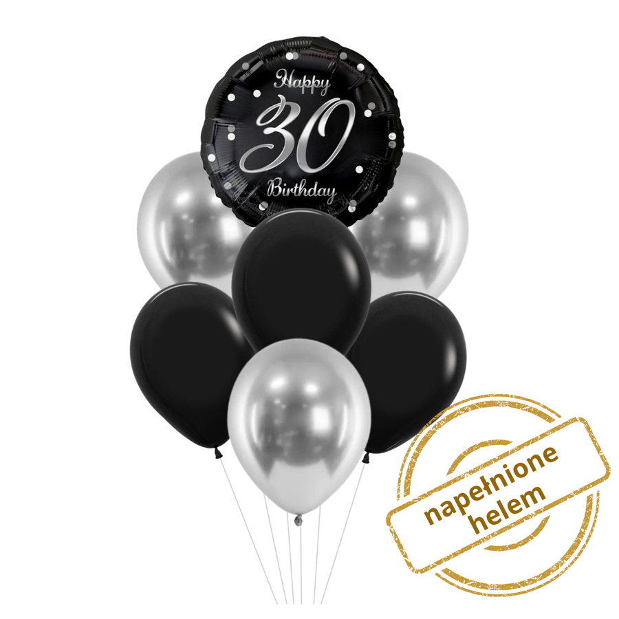Zestaw balonów Bukiet balonowy na 30 urodziny czarno srebrny (7 szt.) Z HELEM