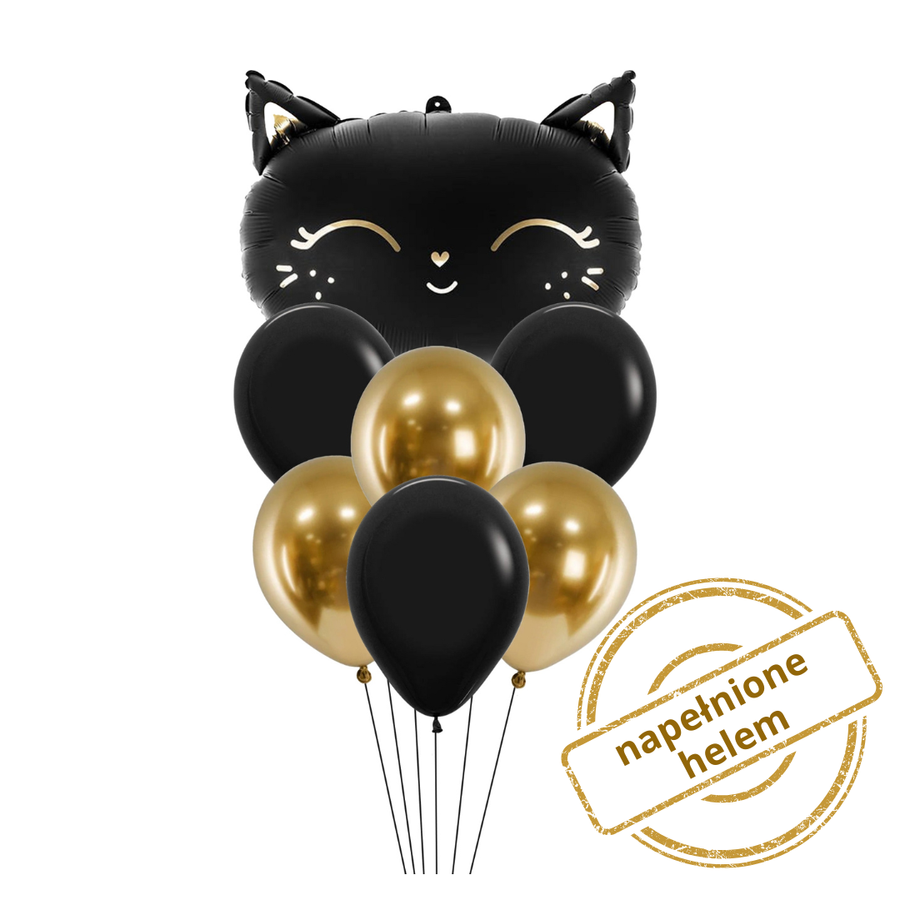 Zestaw balonów bukiet balonowy z kotkiem czarno złoty 7 szt. Z HELEM