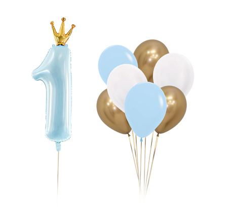 Uroczy zestaw balonów stworzony specjalnie na pierwsze urodziny chłopca! Komplet zawiera 7 idealnie dopasowanych balonów, w tym balon w kształcie cyfry 1 ze złota koroną, dzięki którym stworzysz piękną, niezapomnianą dekorację na ten wyjątkowy dzień.