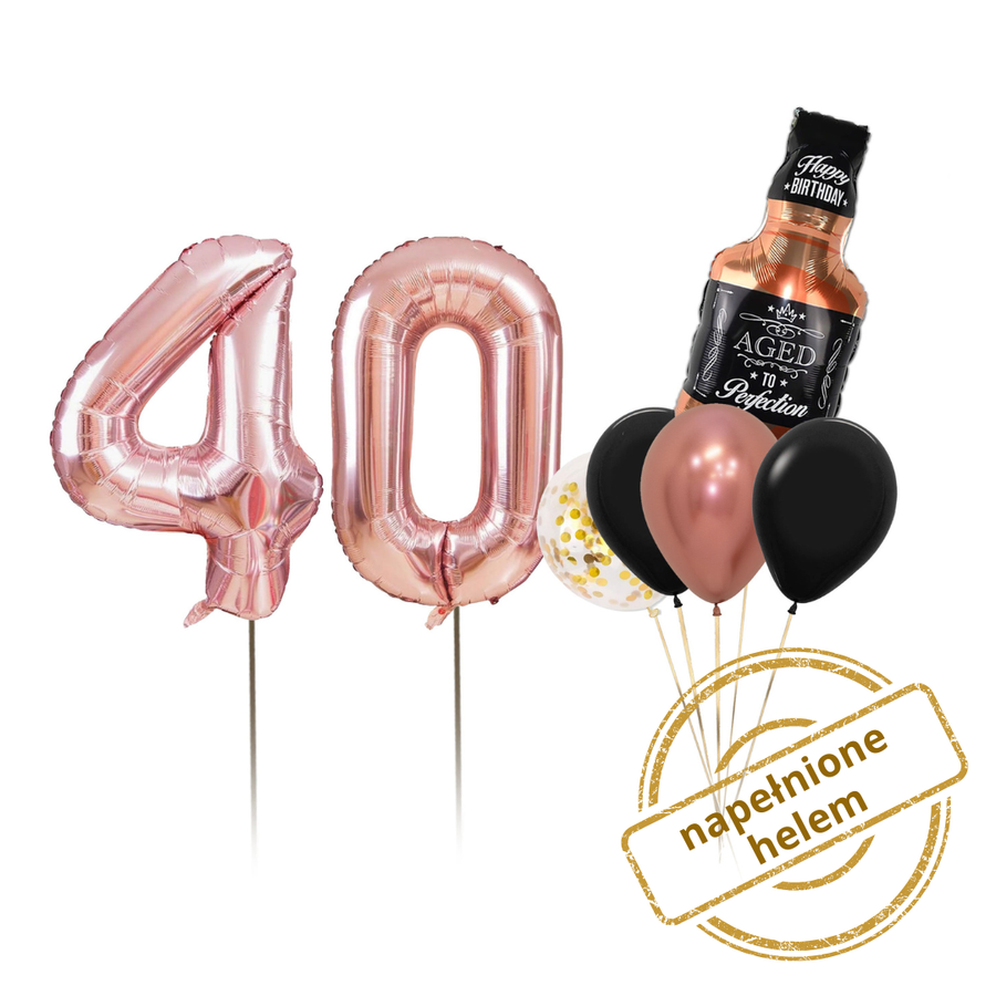 - Zestaw balonów z okazji urodzin z 2 cyframi do wyboru w kolorze złoty róż oraz balonem w kształcie butelki whisky.