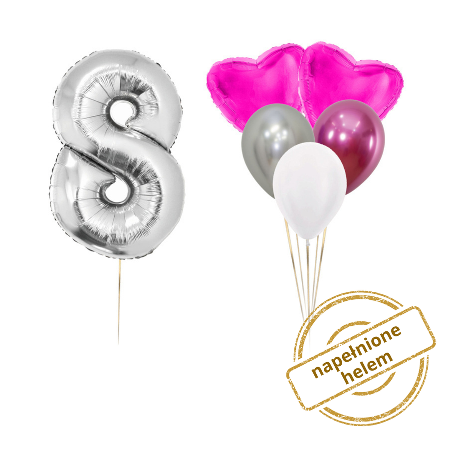 Efektowny zestaw balonów foliowych i lateksowych z fuksjowymi serduszkami i dużej cyfry (do wyboru), idealny na urodziny, jubileusze i imprezy tematyczne. Bukiet składa się z 6 balonów, które stworzą wyjątkową dekorację i podkreślą charakter uroczystości.